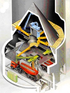 IBAU均化庫(kù)采用德國(guó)漢堡公司的連續(xù)均化技術(shù)。在外部帶一攪拌倉(cāng),庫(kù)底中心設(shè)一大圓錐,庫(kù)內(nèi)生料的重量通過(guò)該錐傳遞給庫(kù)壁,庫(kù)底環(huán)形空間被分成向中心傾斜10度的6個(gè)充氣區(qū),每區(qū)裝設(shè)3種規(guī)格的6個(gè)充氣箱。充氣卸料時(shí)生料先被送至一條徑向布置的充氣箱上,再經(jīng)過(guò)錐體下部的出料口由空氣斜槽送入庫(kù)底中央4000mm計(jì)量倉(cāng)中。卸料時(shí),生料在自上而下的流動(dòng)過(guò)程中,切割水平料層而產(chǎn)生重力混合 作用,進(jìn)入攪拌倉(cāng)后又連續(xù)充氣攪拌而得到進(jìn)一步均化,均化效果H可達(dá)6~8,電耗0.1~0.2Kwh/t生料。
