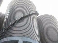 焊接式鋼板倉,是由鋼板焊接而成的,與上兩種相比,其氣密性好,壽命長,存儲量大,單庫可存儲5000-100000噸。是存儲水泥、粉煤灰等大型鋼板庫的理想選擇。